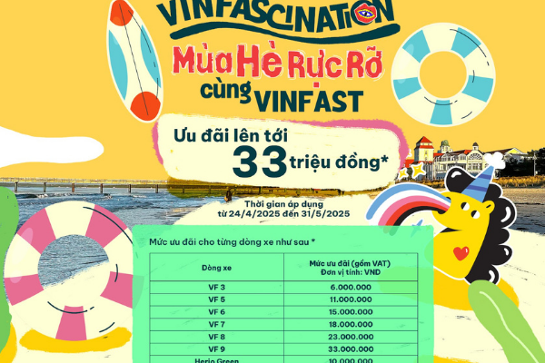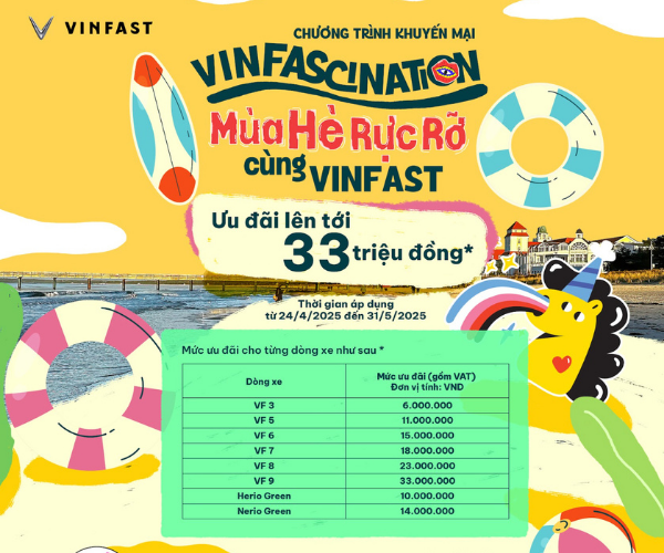 VinFast trân trọng giới thiệu chương trình khuyến mại đặc biệt “VINFASCINATION – Mùa Hè Rực Rỡ Cùng VinFast” dành tặng cho toàn thể Khách hàng luôn tin tưởng đồng hành cùng VinFast trong suốt thời gian qua.