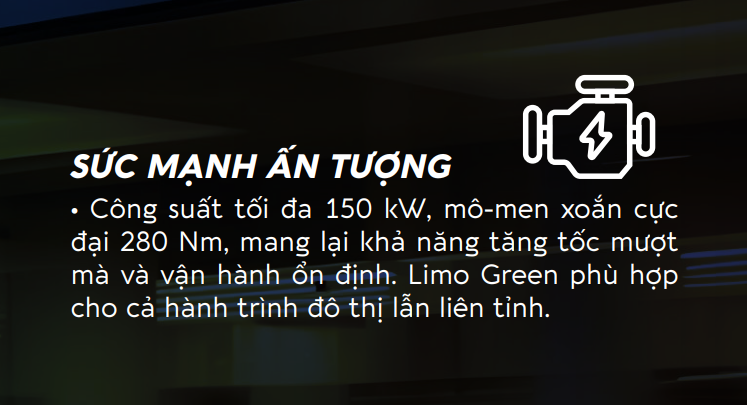 Limo Green là lựa chọn lý tưởng cho mọi nhu cầu di chuyển, từ những chuyến đi hàng ngày cho tới những chuyến đi xa. Đây là chiếc xe mang lại trải nghiệm tận hưởng sự tiện lợi cho mọi hành khách trên mỗi chuyến đi. Dù chọn di chuyển hay chinh phục lợi nhuận, Limo Green là người bạn đồng hành dẫn lối mọi đích đến!